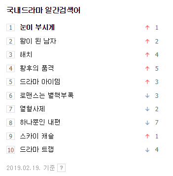 눈이 부시게는 월화드라마의 화요일 방송이 이뤄진 19일 기준 네이버 국내드라마 일간검색어 순위에서 1위를 차지했다. 2위는 왕이 된 남자. 이 역시 시청률(19일 눈이 부시게 5.4%, 왕이 된 남자 10%)과는 상반된 결과였다.