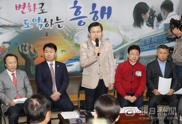 황교안 자유한국당 대표가 9일 포항 흥해읍 행정복지센터에서 열린 지진 피해 이재민들과의 간담회에서 발언하고 있다.