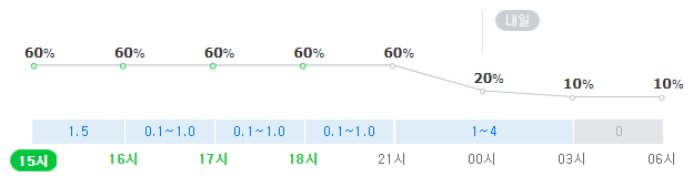 현재 60%의 강수확률이 오후 9시까지 지속되고 이후 낮아진다.