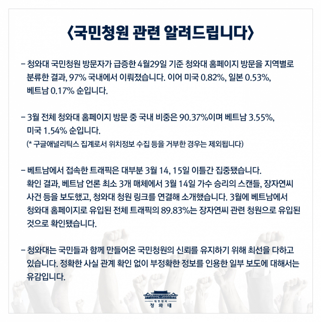 청와대 조사 결과 29일 접속 지역을 살펴보면 국내 97%, 미국 0.82%, 일본 0.53%, 베트남 0.17% 순이었다.