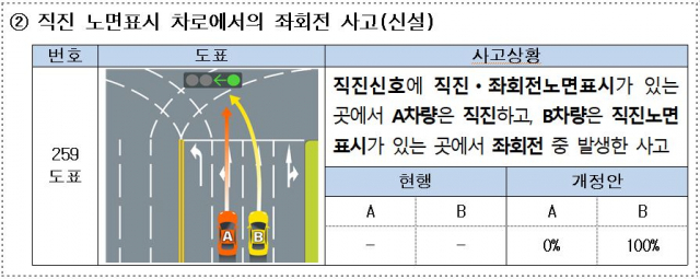 좌회전 전용 차로로 가던 차가 직진·좌회전 동시신호 때 직진해 직·좌 겸용 차로에서 좌회전하던 차량과 부딪히는 경우가 대표적이다. 지금까지는 기준이 없어 9대 1의 쌍방과실로 처리됐지만, 개정안이 적용되면 직진 차량의 100% 과실로 바뀐다. 신호대로 좌회전하던 차가 이를 피하기가 현실적으로 어렵다고 본 것이다.