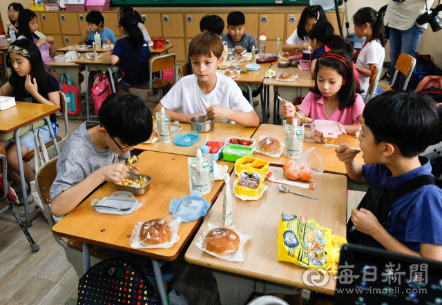 학교 비정규직 노동자 총파업 첫날인 3일 대구 지산초등학교 학생들이 집에서 가져 온 도시락과 학교에서 나눠 준 빵으로 점심 식사를 하고 있다.
