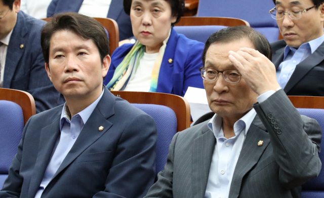 4일 국회 의원총회에서 이해찬 더불어민주당 대표가 같은 당 강창일 의원의 발언을 보고 손으로 'X'자 표시를 해 화제다.