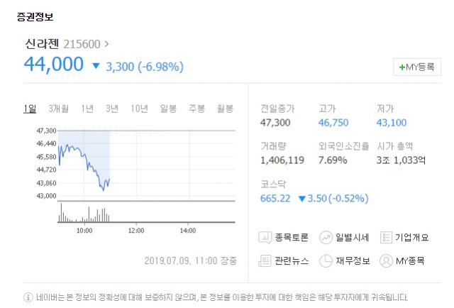 신라젠은 아닐 오전 11시 현재 코스닥에서 전 거래일 대비 6.98%(3천300원) 내린 4만4천원에 거래되고 있다.