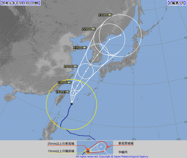 한국 기상청에 따르면 태풍 다나스의 경로는 일본 본토 쪽을 향해 있다.
