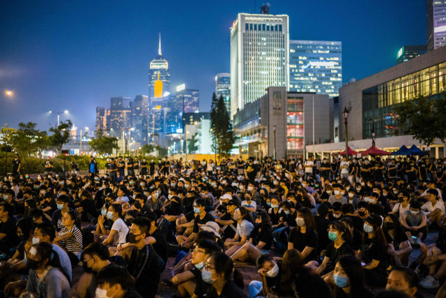 홍콩 학생들이 22일(현지시간) 에든버러 광장에 모여 시위를 벌이고 있는 가운데 한 시위자가 "하늘이여 홍콩을 도우소서'(天祐香港)라고 쓰인 사인을 들어보이고 있다. 사우스 차이나 모닝 포스트는 10개 대학과 100개가 넘는 중고등학교 학생들이 홍콩 정부가 9월13일까지 시위대의 5개 요구조건을 수용하지 않을 경우 더 격렬한 행동에 나설 것이라고 경고하면서 9월2일 대규모 집회를 열고 그때부터 수업 거부에 나설 것이라고 이날 밝혔다. 연합뉴스