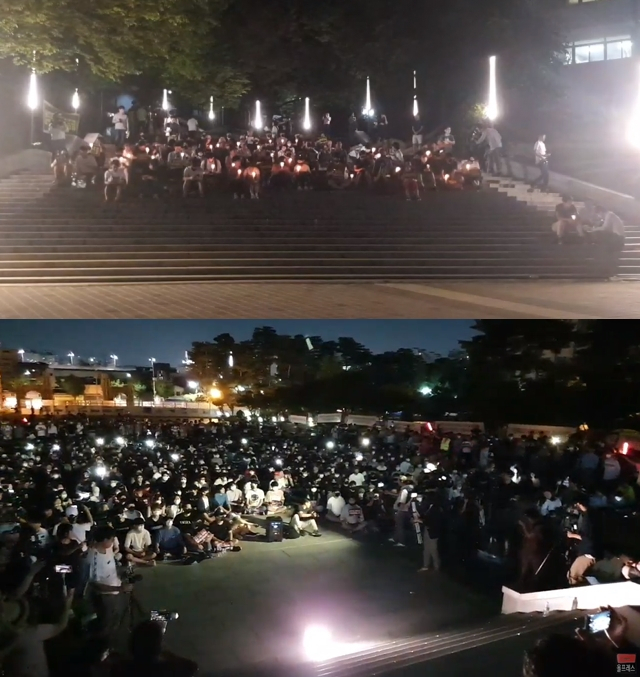 [현장사진] (위)서울대 '시작 20여분 전, 아직은 썰렁' (아래)고려대 '뜨거운 열기' 조국 관련 촛불집회 현장. 유튜브 '이야기' '올프레스' 화면 캡처