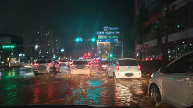 오전 11시부터 오후 3시 사이 내린 집중호우로 포항시내 저지대 도로 곳곳이 침수했다.