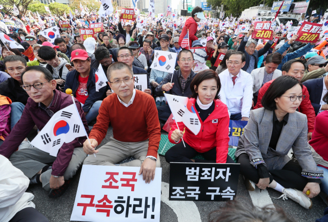 자유한국당 황교안 대표와 나경원 원내대표가 9일 오후 서울 광화문광장에서 범보수단체 주최로 열린 조국 법무부 장관 사퇴 촉구 집회에 참가해 구호를 외치고 있다. 연합뉴스