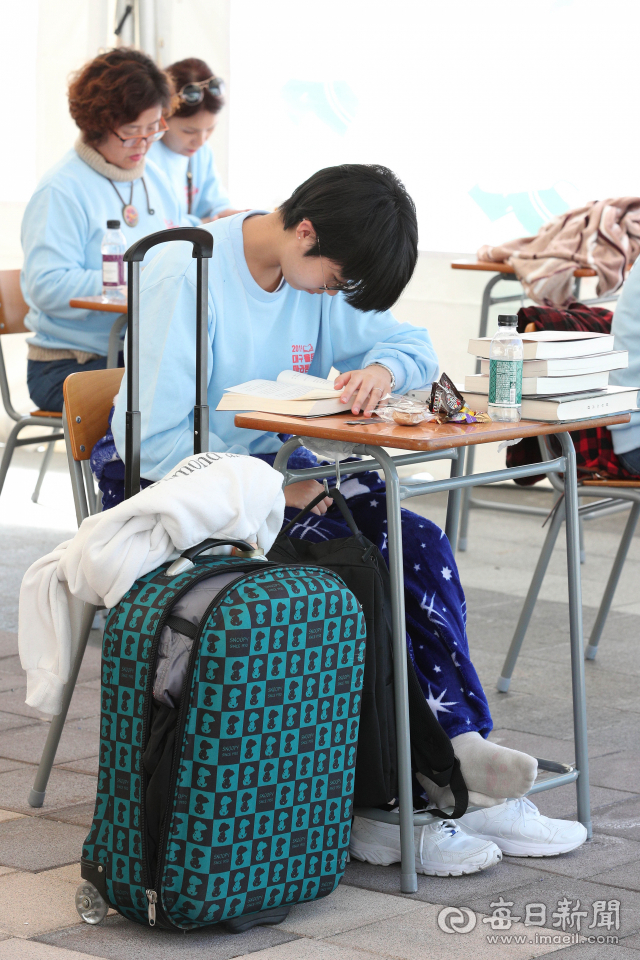 책 읽는 사회 분위기 조성을 위한 '2019 대구 울트라 독서 마라톤 대회'가 12, 13일 무박 2일 일정으로 동대구역 광장에서 열렸다. 한 참가자가 여행용 짐가방을 책상 옆에 놓고 '24시간 책 읽기'에 도전하고 있다.