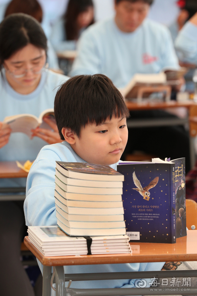 한 어린이 참가자가 해리포터 시리즈 10권을 책상에 올려놓고 '24시간 책 읽기'에 도전하고 있다.