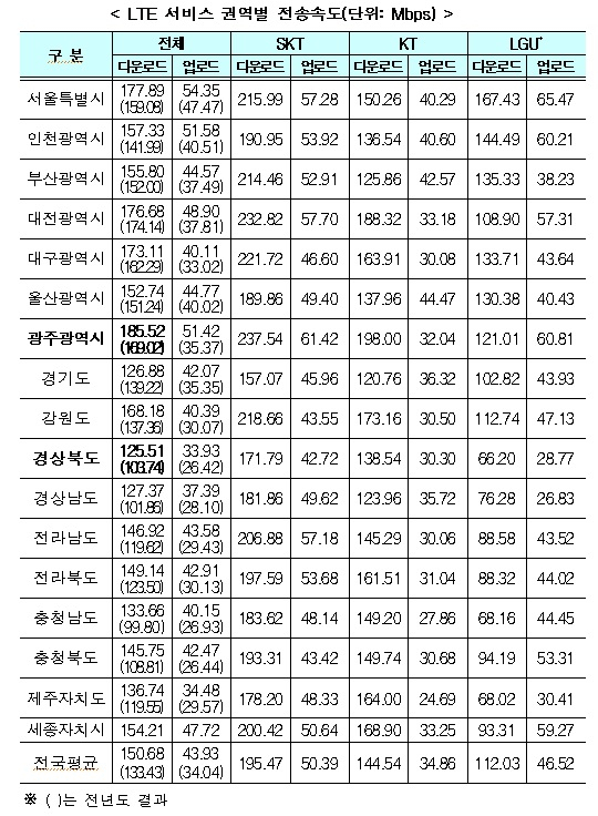 국회 과학기술정보방송통신위원회 박광온 의원(더불어민주당)이 과학기술정보통신부로부터 제출받은 'LTE 서비스 지역별 품질 서비스 조사'에 따르면 지난해 이통 3사 평균 다운로드 속도는 경북이 125.51Mbps로 전국 17개 시·도 중 가장 느렸다. 같은 기간 전국 평균은 150.68Mbps였다. 경북의 경우 LTE 업로드 속도도 33.93Mbps로 꼴찌였다.