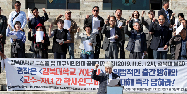 경북대 민주화교수협의회(민교협), 민주평등사회를 위한 전국교수연구자협의회, 대구참여연대, 대구경북지역 대학민주동문회, 경북대 70년사 정상화 동문·시민연대 등 학내외 12개 단체는 6일 경북대 본관 앞에서 기자회견을 열고 이 같은 내용의 성명서를 발표했다.