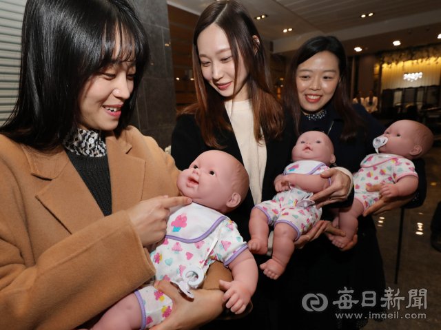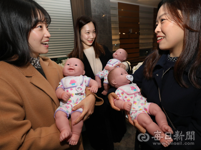 9일 오후 대구 삼성창조캠퍼스에서 열린 '제10회 대구시 출산장려의 날' 기념행사에서 여성들이 실물크기의 신생아 인형 안아보기 체험을 하고 있다.