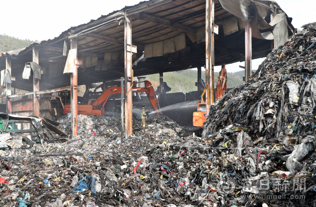 경북 고령군 개진면 한 폐기물 처리업체에서 불이 나 18일 소방대원들이 진화작업을 벌이고 있다.