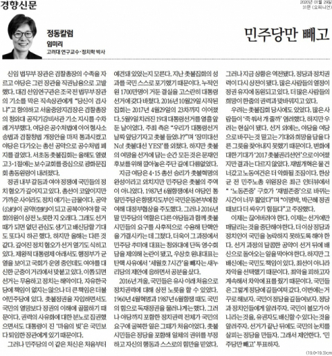 임 교수는 지난달 29일 경향신문에 '민주당만 빼고'라는 제목의 칼럼을 냈다.