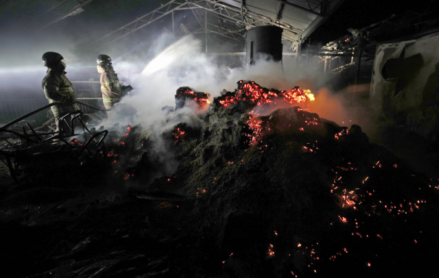 지난 24일 발생해 소강상태를 보이던 안동 산불이 강한 바람에 재확산한 25일 오후 경북 안동 남후면 고하리에서 소방대원이 돈사로 번진 화재를 진화하고 있다. 김영진 기자 kyjmaeil@imaeil.com