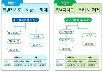 대구시는 광역행정 특수성과 효율성이 보장되도록 행정통합 이후 단기적으로 현행 광역행정시스템을 유지한다. 대구와 경북은 2022년 대구시장 및 광역·기초의원 선거를 그대로 유지하는 과도기 특별자치도를 출범 시킨 뒤 2030년 1도 32개 시·군·구라는 완전한 형태의 대구경북특별자치도를 완성한다는 구상이다. 특별자치도 청사 위치는 ▷현 경북도청사 자리 ▷2025년 완공될 대구시 신청사 ▷제3의 새로운 입지 등이 검토되고 있다.