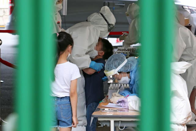 18일 오후 광주 서구 치평동 계수초등학교 주차장에 마련된 이동선별진료소에서 의료진이 울음을 터뜨리는 아이를 달래고 있다. 방역 당국은 재학생인 남매가 코로나19 확진 판정을 받아 계수초 전교생에 대해 전수검사를 하기로 했다. 연합뉴스