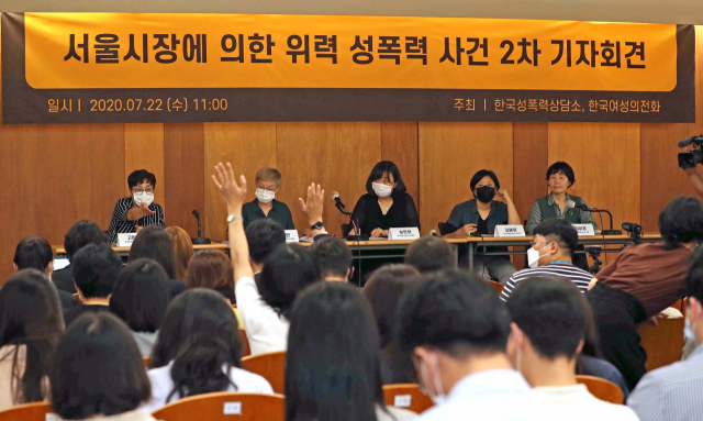 22일 오전 서울 중구 한 기자회견장에서 열린 '서울시장에 의한 위력 성폭력 사건 2차 기자회견'에서 참석자들이 취재진의 질문을 받고 있다. 연합뉴스