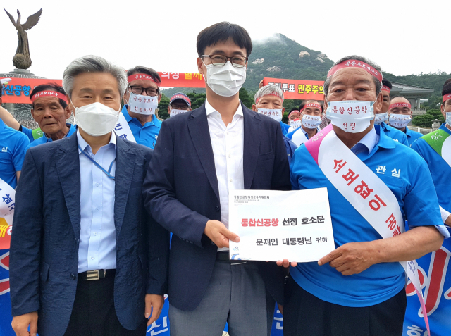 통합신공항 의성군유치위원회(이하 의성유치위)와 의성군민 40여 명은 27일 오전 11시 청와대 앞 분수대에서 "숙의형 시민의견조사 결과를 토대로 주민투표까지 마쳤는데 왜 통합신공항 이전 부지를 선정하지 않는냐"며 국방부를 성토했다.
