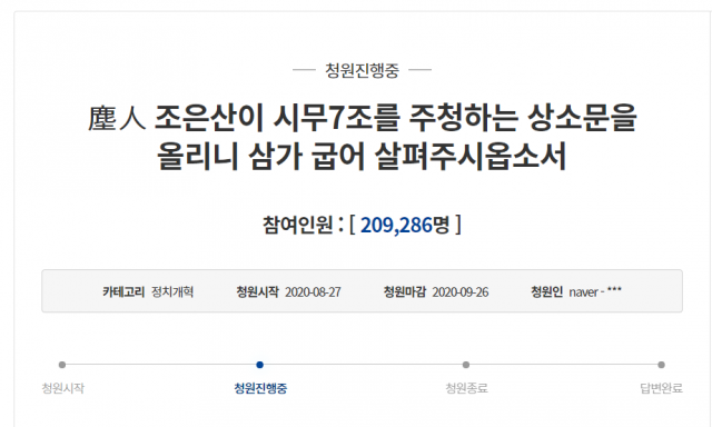 지난 12일에 '진인(塵人) 조은산이 시무(時務) 7조를 주청하는 상소문을 올리니 삼가 굽어살펴주시옵소서'라는 제목으로 올라온 이 청원에는 이날 오전 10시 기준 20만9천286명이 동의했다.