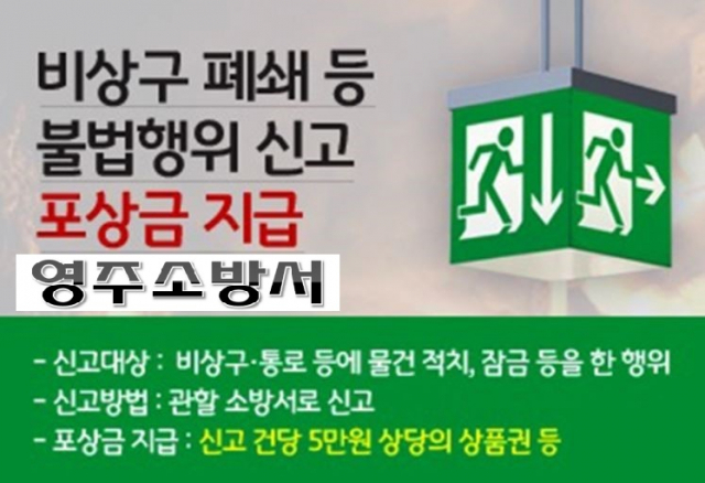 황태연 영주소방서장은 "인명 피해를 사전에 차단하기 위해 신고포상제를 운영한다"며 "생명의 문인 비상구에 대한 시설관리자와 시민들의 관심이 필요하다"고 했다.