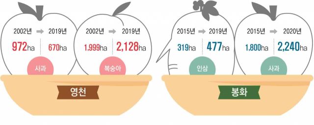 영주시의 인삼, 사과도 재배지가 봉화군으로 이동하고 있다. 봉화 인삼재배지는 2015년 319ha에서 지난해 477ha로 늘었다. 사과 역시 2015년 1천800ha에서 올해 2천240ha로 증가 추세다.