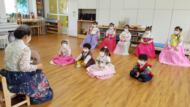 추석을 열흘 앞둔 지난 22일은 특별한 날이었다. 평소 강의 시간마다 한복을 곱게 차려 입고 이야기를 들려주는 강점희 이야기 할머니와 같이 유아들도 알록달록한 한복을 예쁘게 차려입고 할머니를 맞이했다. 이어 유아들은 이야기 할머니에게 큰 절을 올리며 인사를 나눴다.