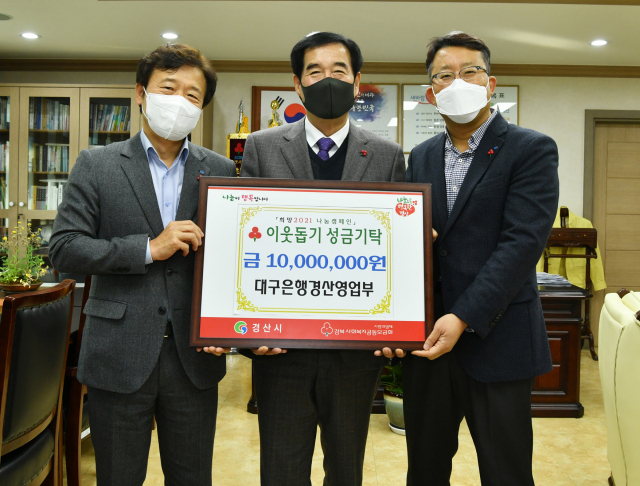 대구은행 경산영업부는 최근 경산시청을 방문해 이웃돕기 성금 1천만원을 기탁했다. 경산시 제공