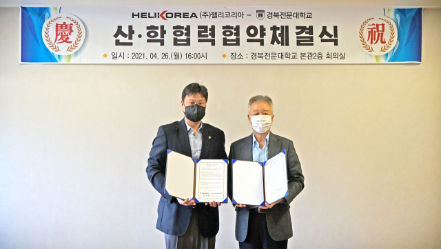 경북전문대학교(총장 최재혁)는 26일 본관 회의실에서 ㈜헬리코리아(대표이사 민경조)와 산업 수요에 맞는 전문인력 공동양성 및 상호 간 협력체계 구축을 위한 업무협약식을 했다.