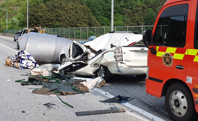 앞서 지난 14일 오후 3시 50분경 충북 보은군 당진영덕고속도로 영덕방향 수리터널 21㎞ 지점에서 25t 화물차에 실린 핫코일이 떨어져 일가족이 탄 승합차를 덮쳤다.