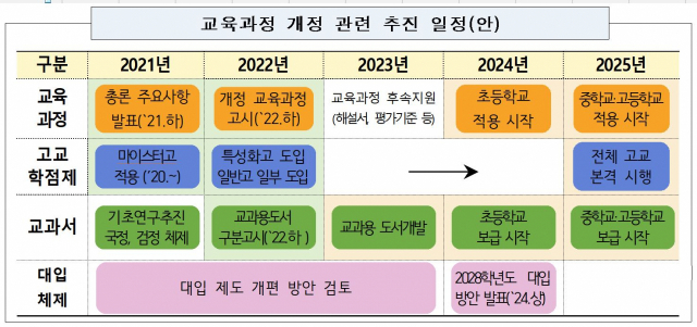 교육부 측은 "고교학점제 추진 계획을 토대로 학생 개개인이 자기주도적으로 진로와 학업을 설계할 수 있게 고교 과목 구조도 개편한다"며 "공동교육과정 운영, 학교 밖 학습 경험 인정 등 고교 교육과정 혁신의 기반을 마련할 계획"이라고 했다.