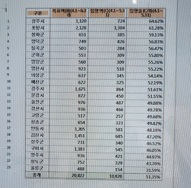 2분기 도내 평균 집행률 51.35%에 크게 못 미치는 실적이다. 2분기 재정조기집행률 1위 상주시 64.62%, 2위 포항시 61.28%, 3위 봉화군 59.13%, 4위 영덕군 56.83%, 5위 칠곡군 56.47% 등과 대조이다.