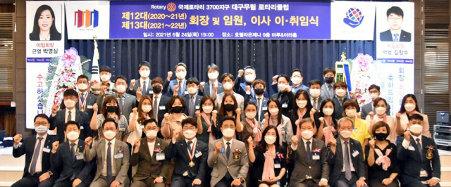 국제로타리3700지구 대구무림로타리클럽은 지난 24일 호텔라온제나에서 제12·13대 회장단 이·취임식을 가졌다. 근영 박영실 이임회장님의 뒤를 이어 백범 김창수 회장님이 취임하였으며 세동 이동희 총재님을 비롯한 70여명의 회원 및 내빈이 참석하여 축하의 자리를 가졌다.