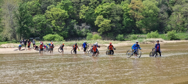 도리없이 다들 자전거를 어깨에 메고 발을 둥둥 걷고서 내성천 도하작전에 돌입하여 마을로 들어간다. 때아닌 이색 진풍경에 함박웃음이 연신 터진다. 4월! 노란 유채꽃으로 뒤덮힌 회룡포 마을은 모두의 입을 다물지 못하게 만들었다. 끝간데 없이 펼쳐진 봄꽃의 향연은 "과연 회룡포!" 딱 한마디로 마침표를 찍는다. 정말이지 예천땅은 이야기의 연속이다.
