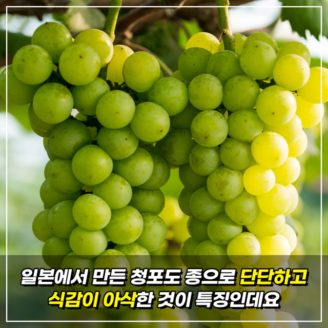 일본에서 만든 청포도 종으로 단단하고 식감이 아삭한 것이 특징인데요. 머스캣향이 강하여 씹으면 씹을수록 망고를 씹는 것 같은 착각(?)에 빠지는 샤인머스캣!