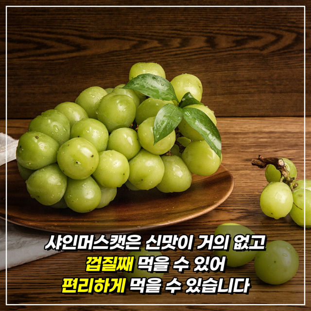 샤인머스캣은 신맛이 거의 없고 껍질째 먹을 수 있어 편리하게 먹을 수 있습니다.