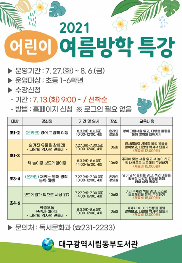 대구동부도서관이 여름방학을 맞은 초등학생을 위해 여름방학 특별강좌 6개를 운영한다. 어린이들이 독서에 대해 흥미를 느끼고 창의력을 키울 수 있게 돕는 프로그램들이다.
