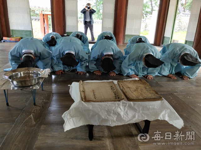 이날 소수서원 유림들은 소수서원에 도착한 2권의 고문서를 강학당에 옮겨 놓고 봉환 예를 갖춘 뒤 소수박물관 수장고로 입고했다.
