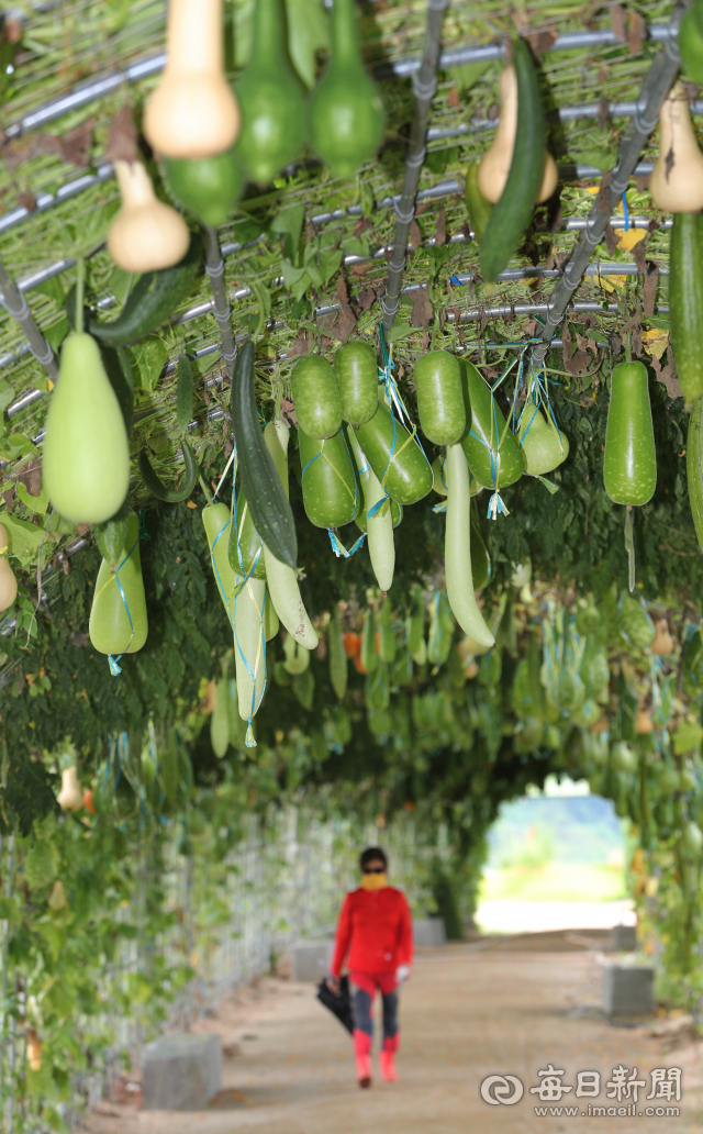 9일 대구 북구 금호강 하중도 박터널에 수세미와 호롱박 등 다양한 모양의 박이 주렁주렁 매달려 볼거리를 제공하고 있다. 성일권 기자 sungig@imaeil.com