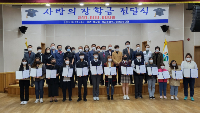 경북 칠곡군 북삼읍지역사회보장협의체(민간위원장 최충원)는 지난 27일 초·중·고교 학생 13명에게 장학금 1천만원을 전달했다. 장학금은 협의체 위원들이 1년 간 고구마와 쌀 등을 재배·판매해 거둔 수익과 기부 등으로 마련했다.