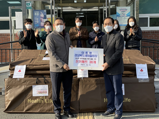 이종평 경상북도새마을회 회장은 6일 취약계층을 위해 전기매트 36개를 청도 매전면사무소에 기탁했다. 이날 기탁한 전기매트는 제47회 금오대상 사회봉사부문 수상자로 선정돼 받은 상금 500만원으로 구입했다.