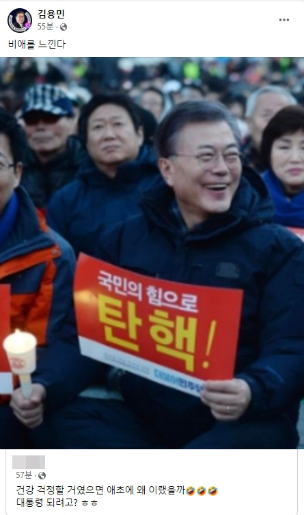 ▶김용민 이사장은 조금 앞선 이날 오후 4시 25분쯤에는 페이스북에 과거 박근혜 탄핵 촛불집회에 참석한 문재인(당시 전 더불어민주당 대표) 대통령의 활짝 웃는 사진 및 '건강 걱정할 거였으면 애초에 왜 이랬을까. 기쁨의 눈물 이모티콘 3개. 대통령 되려고? ㅎㅎ'라고 적힌 글을 공유, 여기에 '비애를 느낀다'라고 짧게 덧붙였다.