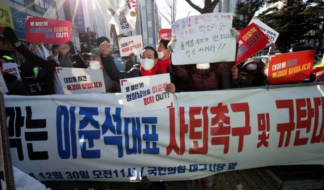 윤석열 국민의힘 대선후보 지지자들이 30일 오전 대구 수성구 국민의힘 대구시당 앞에서 이준석 대표 사퇴촉구 집회를 열고 있다. 김영진 기자 kyjmaeil@imaeil.com