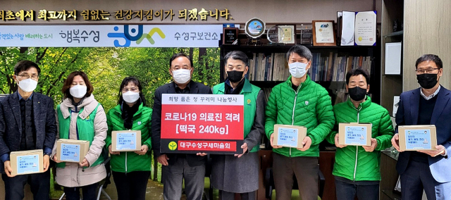 대구 수성구 새마을회(회장 양균열)는 지난 6일 수성구보건소를 방문하여 코로나19 방역의 일선현장에서 땀흘려 일하는 의료진에게 격려품(떡국 떡) 160박스를 전달했다.