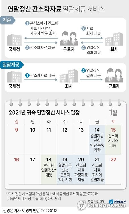 이 절차를 거친 회사와 근로자에 대해서는 국세청이 부양가족을 포함한 근로자의 간소화 자료를 21일부터 회사에 일괄 제공할 계획이다.