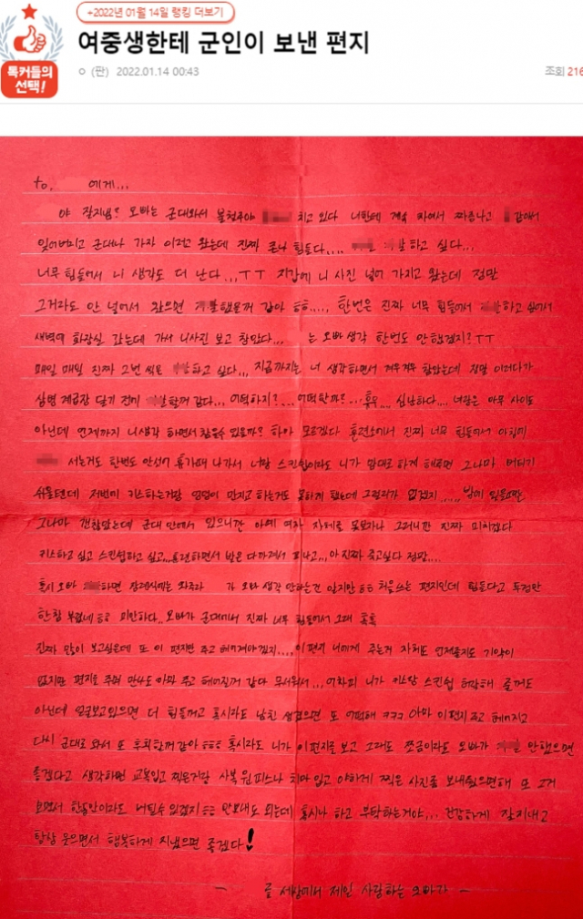 지난 14일 온라인 커뮤니티 네이트판에는 '여중생한테 군인이 보낸 편지'라는 제목의 글이 올라왔다. 글쓴이 A씨는 "이번 위문편지 사건을 접하고 생각이 많아져 제가 중학생 때 군인한테 받은 편지를 공개하게 됐다"고 운을 뗐다.
