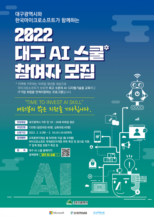 김동우 대구시 일자리투자국장은 "세계적 기업인 한국마이크로소프트와 협력해 AI·디지털 분야 인재를 양성하는 대구 AI 스쿨이 인재양성의 요람이 되도록 적극 지원하겠다"며 "청년은 신산업 분야 취업 기회를 얻고 기업은 핵심 인재를 얻을 수 있기를 기대한다"고 말했다.
