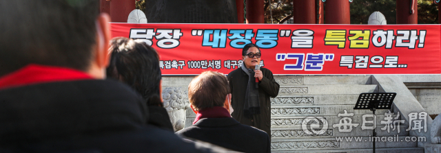 28일 오후 대구 중구 국채보상운동기념공원에서 '대장동 그분 구속수사 촉구 1000만인 서명' 대구운동본부 발대식이 열리고 있다. 안성완 기자 asw0727@imaeil.com